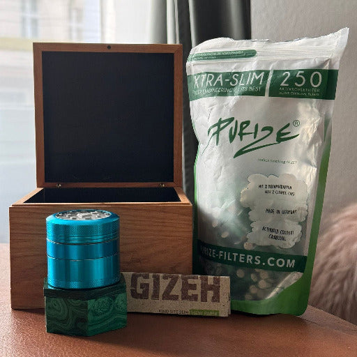 Ich bin nicht super sophisticated, wenn es um mein Set geht, aber ich habe meinen kleinen Grinder und die Box, wo ich alles verstauen kann. In der Holzbox sind meine Blättchen, ein paar Tips, die Kräuter und das Weed in kleine Gläser, wie du hier sehen kannst. Ich drehe mir meistens Joints mit Kräutern zum Rauchen und Weed.